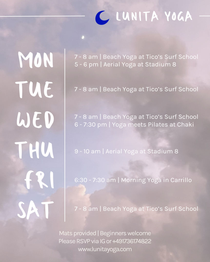 I offer at least one yoga class in Playa Sámara and surroundings each weekday and am happy to schedule private sessions anytime. Check out my current schedule below — I’d love to flow with you on the mat!